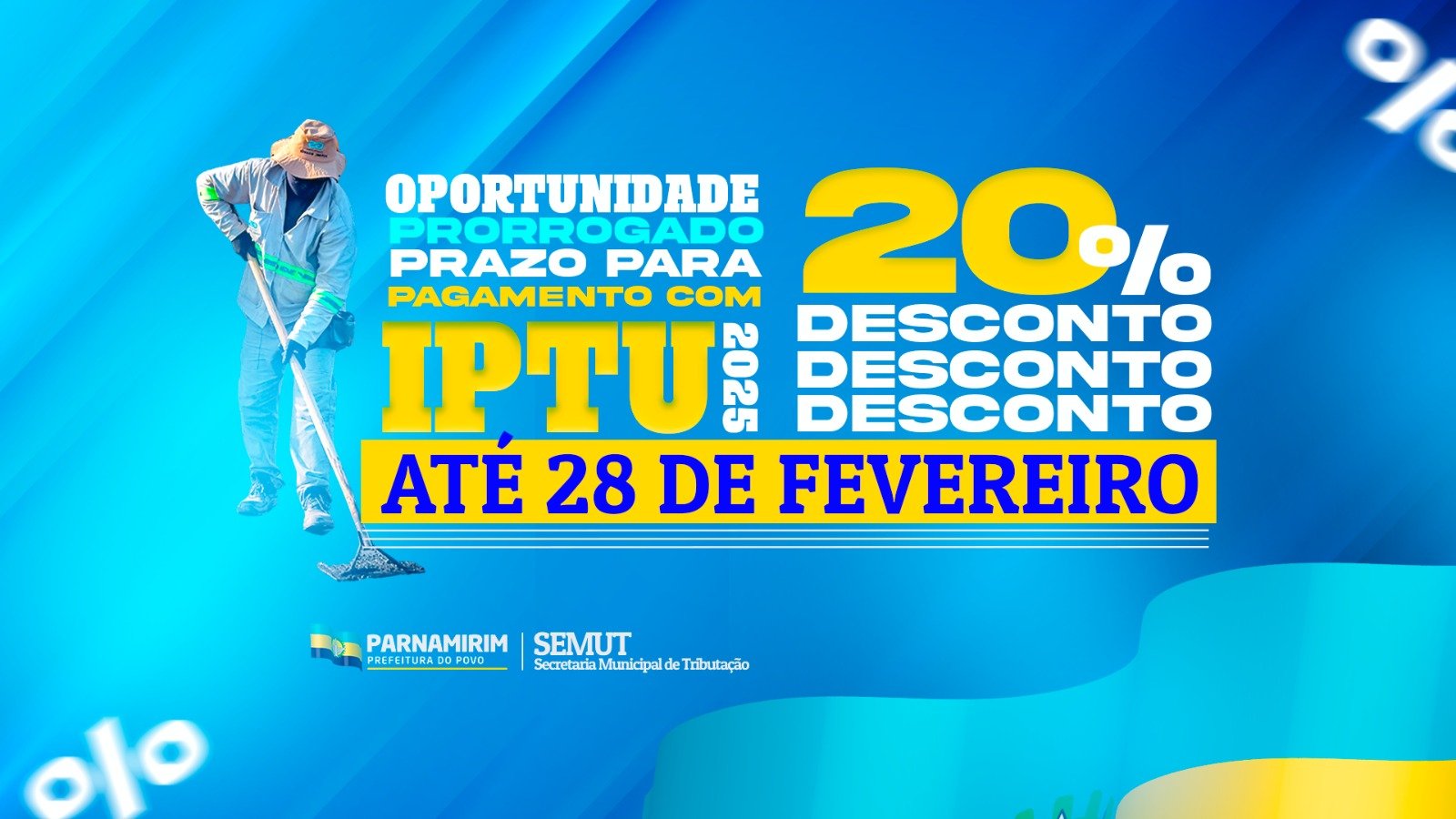 A Prefeitura de Parnamirim informa que esta sexta-feira (28) é o último dia para quitar o Imposto Predial e Territorial Urbano (IPTU) de 2025 em cota única com 20% de desconto. Essa é uma oportunidade imperdível para economizar e ainda contribuir com o desenvolvimento da cidade. O contribuinte pode emitir o boleto de pagamento de forma rápida e prática através dos canais online, por meio do Portal do Contribuinte, no site da Prefeitura, Whatsapp 3644-8313 ou presencialmente nos seguintes pontos: A Prefeitura de Parnamirim reforça a importância do pagamento do IPTU dentro do prazo para garantir os benefícios e contribuir com o desenvolvimento da cidade. Não deixe para a última hora e aproveite essa oportunidade de economizar.