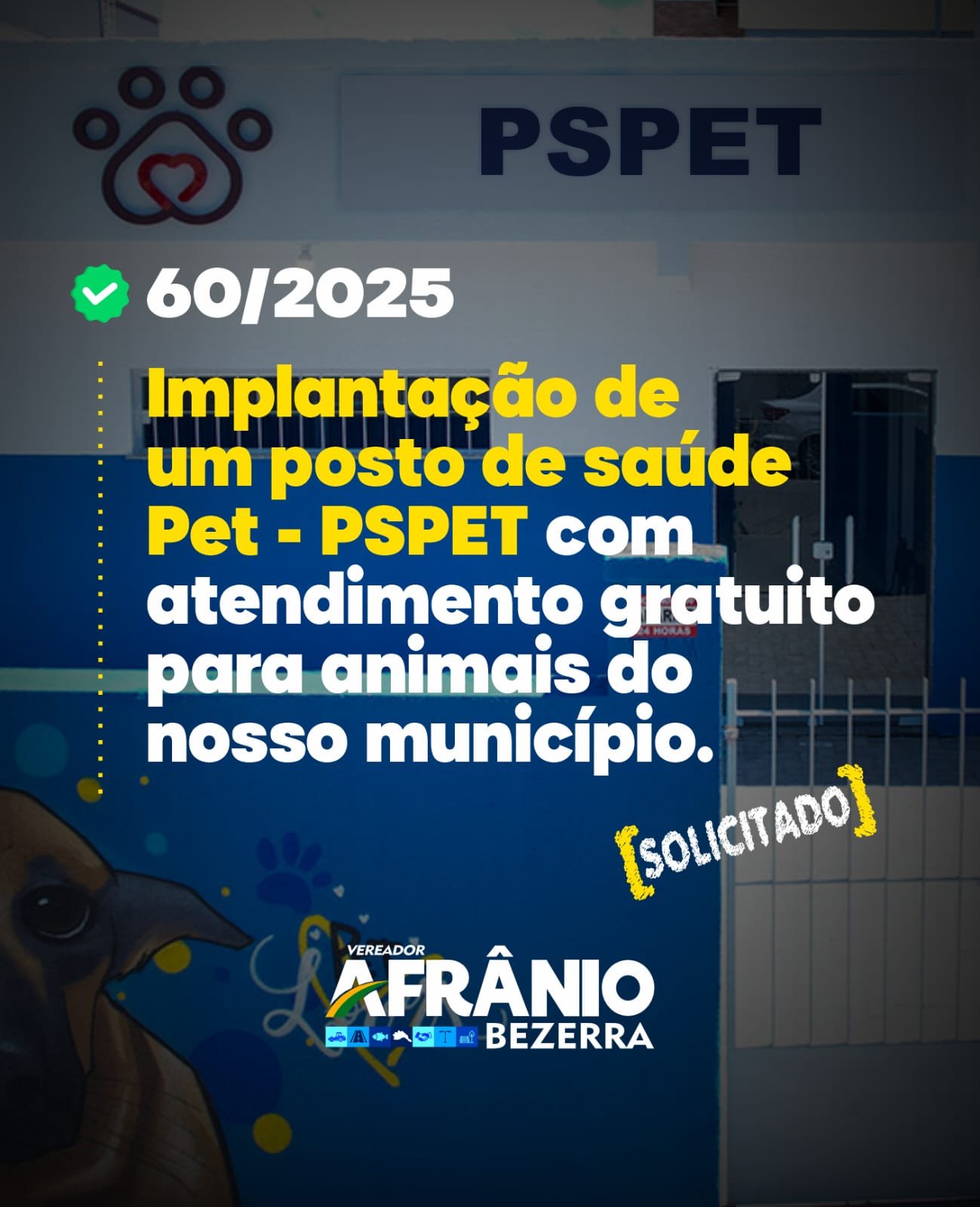 Vereador Afrânio Bezerra solicita implantação de Posto de Saúde Pet (PSPET) para atendimento gratuito a animais