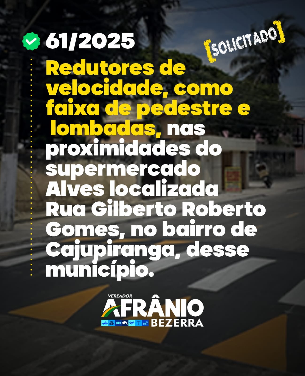 Vereador Afrânio Bezerra Solicita Redutor de Velocidade com Faixa de Pedestre e Lombada 🚦🚧
