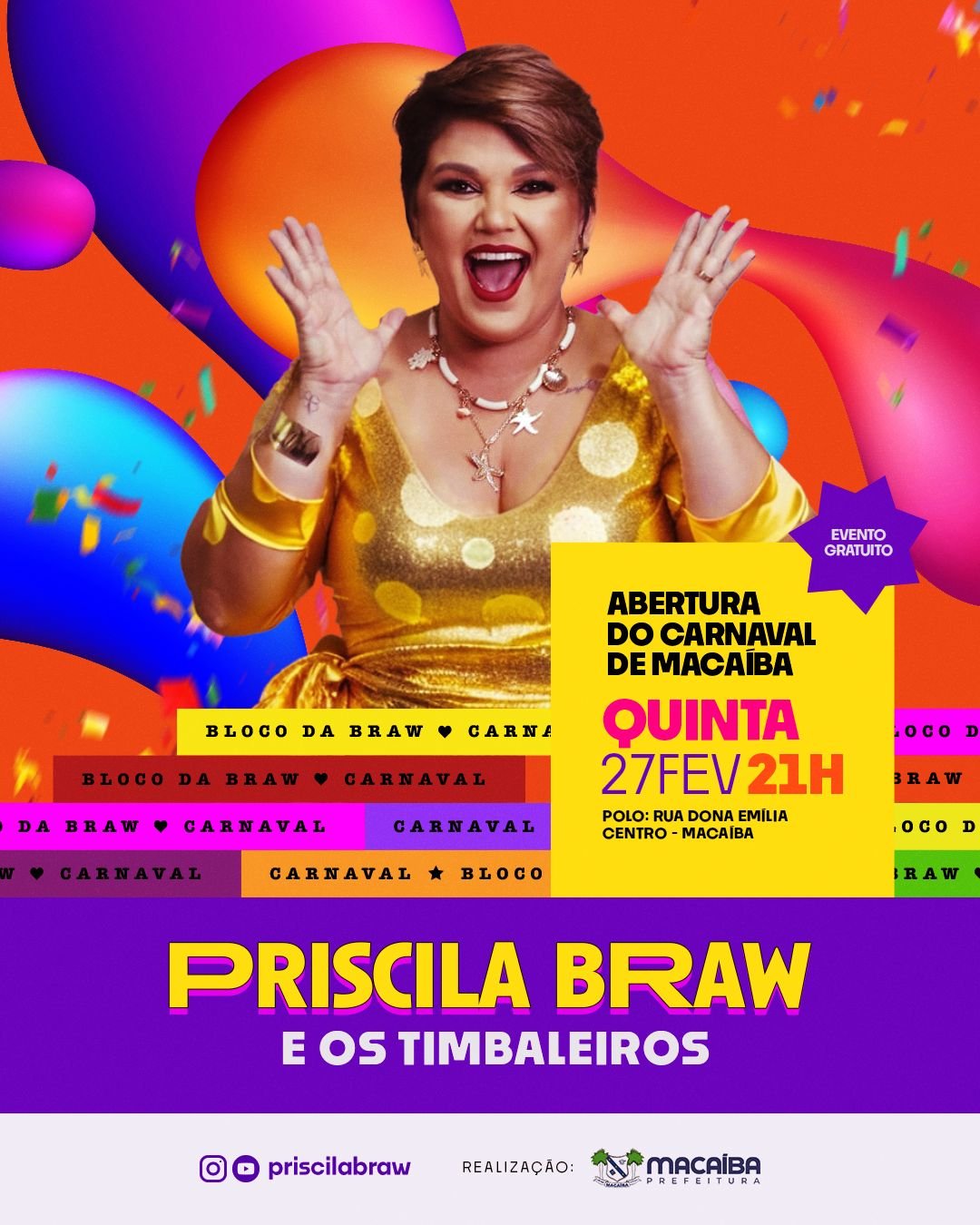 A cantora Priscila Braw e a banda Timbaleiros são as responsáveis pela abertura do Carnaval de Macaíba nesta quinta-feira, trazendo uma energia contagiante para dar início à folia! Com muita animação e a irreverência do axé, Priscila Braw vai incendiar o público com sua voz marcante, enquanto os Timbaleiros vão garantir que ninguém fique parado com seu som envolvente. Prepare-se para uma noite inesquecível, cheia de ritmo, alegria e muita diversão! O Carnaval de Macaíba já começa com o pé direito, e você não pode ficar de fora dessa festa incrível!