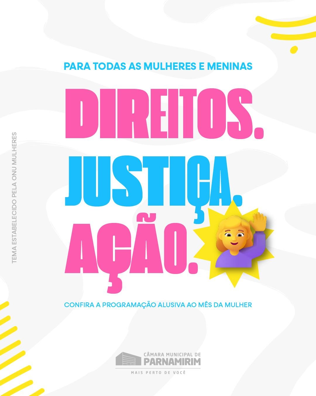 Inspirada no tema da ONU para 2026: Direitos. Justiça. Ação. Para todas as mulheres e meninas, a Câmara de Parnamirim preparou uma programação especial ao longo da semana. 👀💁♀️ Roda de conversa, tribuna livre, ações especiais, visitas e momentos de diálogo que valorizam histórias, experiências e o protagonismo feminino. 💜✨ Porque quando as mulheres ocupam espaços, compartilham histórias e levantam suas vozes, toda a sociedade avança. 🌸 📲 Deslize e confira a programação completa. #casalegislativa #camaradeparnamirim #parnamirimrn #programação CÂMARA MUNICIPAL DE PARNAMIRIM