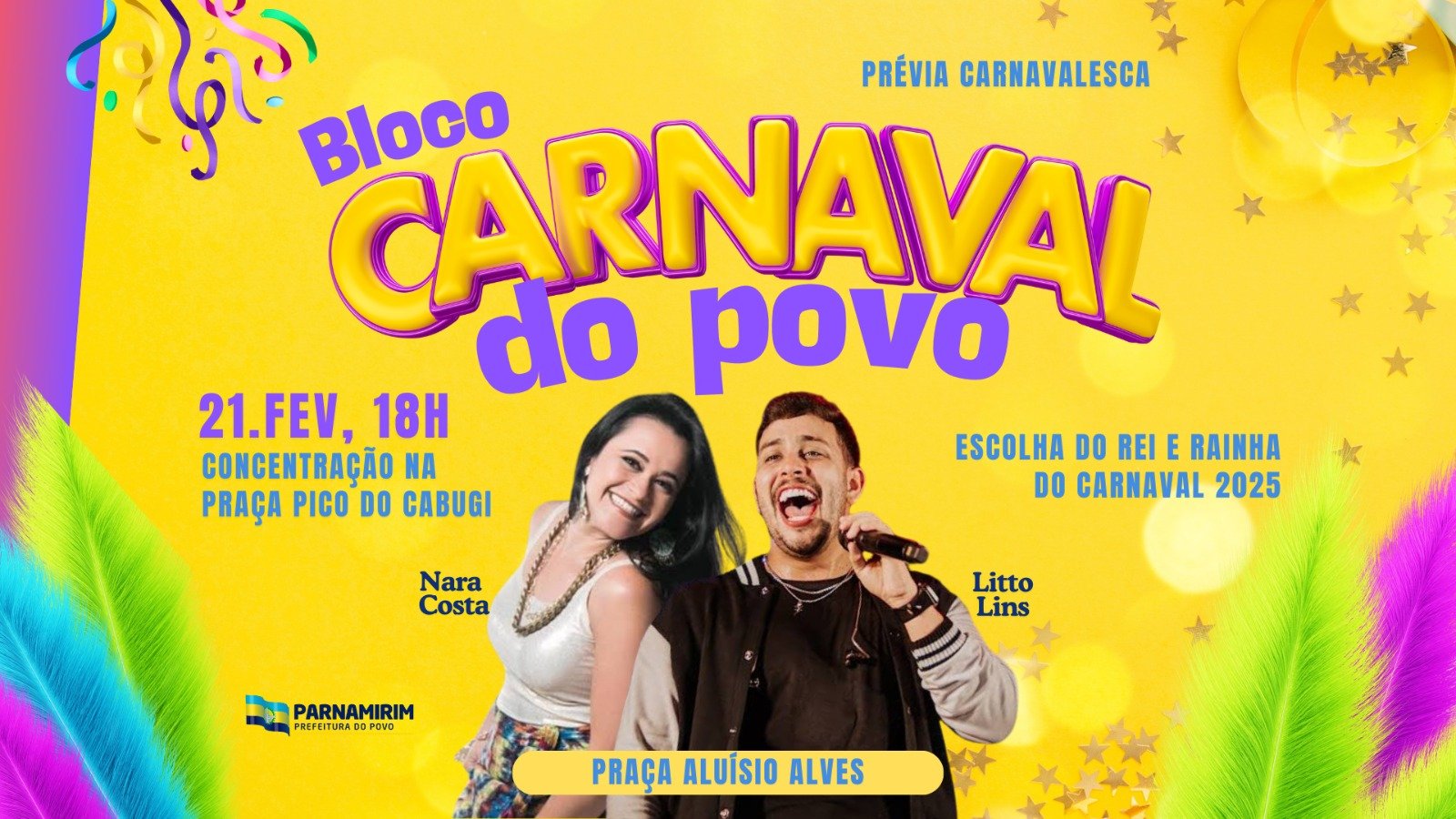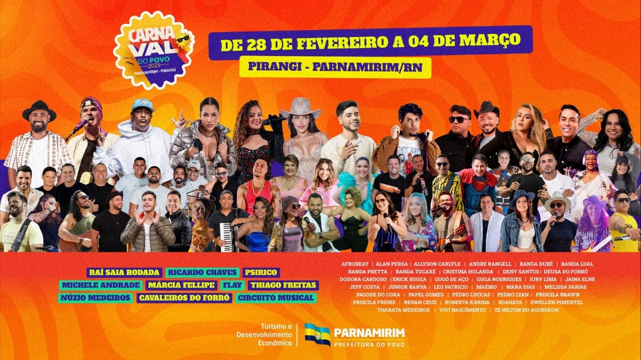O CARNAVAL DO POVO A Prefeitura de Parnamirim divulgou a programação oficial do Carnaval 2025! O tradicional evento será realizado na Praia de Pirangi, um dos principais e mais badalados pontos turísticos de todo o Rio Grande do Norte. Serão seis dias de muita música, dança e diversão, com 50 atrações nacionais e locais como Raí Saia Rodada, Ricardo Chaves, Psirico, Michele Andrade, Márcia Felipe, Flay, Núzio Medeiros, Thiago Freitas, Cavaleiros do Forró e muito mais! Além disso, a programação inclui desfiles de blocos, troças e bandas de frevo que prometem animar o público. Não perca a oportunidade de vivenciar o Carnaval de Parnamirim! Confira a programação oficial e marque sua presença na Praia de Pirangi. Vai ser uma festa inesquecível! Sexta-feira (21/02) – Prévia Carnavalesca e Escolha do Rei e RainhaPraça Aluízio Alves, no Parque Industrial, a partir das 18h:LITTO LINSNARA COSTAORQUESTRA DA SEMUC Sexta-feira (28/02)Praça São Sebastião, em Pirangi, a partir das 18h:GOGÓ DE AÇODODORA CARDOSOSWELLEN PIMENTEL No pranchão:BANDA SOANATA Trio 1:ALLYSON CARLYLEZÉ HILTON Trio 2:RAÍ SAIA RODADAPAGODE DO COXA Sábado (01/03)Carnaval Kids, a partir das 16h:MARA DIAS (TRIO)RENAN CRUZ (PALCO) Praça São Sebastião, a partir das 18h:PAPEL GOMESALAN PERSACRISTINA HOLANDA Pranchão:LITTO LINSERICK SOUZA Trio 1:ROBERTA KARINA Trio 2:TOCAXÉAFROBEAT Trio 3:CAVALEIROS DO FORRÓPSIRICO Domingo (02/03)Praça São Sebastião, a partir das 18h:JAINA ELNEMELISSA FARIASMAÉBIO Pranchão:PRISCILA FREIREPEDRO LYAN Trio 1:JEFF COSTAANDRÉ RANGEL Trio 2:NÚZIO MEDEIROSMÁRCIA FELIPE Segunda-feira (03/03) – Bloco das Virgens, a partir das 16hPraça São Sebastião, a partir das 18h:BANDA LUALVIVI NASCIMENTODENY SANTOS Pranchão:BANDA PRETTADEUSA DO FORRÓ Trio 1:PRISCILA BRAWFLAY Trio 2:MICHELE ANDRADERICARDO CHAVES Terça-feira (04/03)Praça São Sebastião, a partir das 18h:YURE LIMALÉO PATRICIOTHÁBATA MEDEIROS Pranchão:JUNIOR BAHYABANDA DUBÊ Trio 1:GUGA RODRIGUESPEDRO LUCCAS Trio 2:THIAGO FREITASCIRCUITO MUSICAL A prefeita de Parnamirim, Nilda Cruz, disse que as atrações do Carnaval do Povo 2025 foram cuidadosamente escolhidas para animar a noite dos foliões e garantir ótimas vendas e renda extra às famílias que vão trabalhar durante a festa. “O Carnaval de Parnamirim é uma grande festa que movimenta vendedores ambulantes, hoteis, pousadas, restaurantes e o comércio em geral. Tudo foi preparado com muita atenção e carinho. Esperamos que seja uma linda festa para todos, com tudo que o povo de Parnamirim merece e tem direito”, disse Nilda.