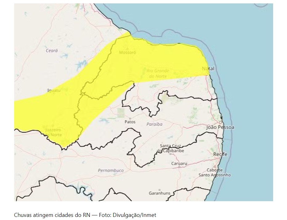 Aviso é da cor amarela, que prevê chuvas de até 50 mm por dia, e tem validade até 11h desta quinta-feira (20). Chuvas atingem cidades do RN — Foto: Divulgação/Inmet O Instituto Nacional de Meteorologia (Inmet) emitiu um alerta de chuvas intensas para Natal e outras 103 cidades do Rio Grande do Norte. O aviso é válido até 11h desta quinta-feira (20). (Veja lista de cidades mais abaixo). O alerta é da cor amarela, que representa perigo potencial, o nível mais baixo entre os três no grau de severidade do órgão. Os outros dois níveis são: laranja (perigo) e vermelho (grande perigo). 📳Participe do canal do g1 RN no WhatsApp No nível amarelo, segundo o Inmet, são previstas chuvas entre 20 e 30 milímetros por hora ou de até 50 milímetros por dia. Além disso, há possibilidade de ventos intensos entre 40 e 60 km por hora. Segundo o órgão, nesse tipo de alerta, há baixo risco de corte de energia elétrica, queda de galhos de árvores, alagamentos e de descargas elétricas. O Inmet recomenda, em caso de rajadas de vento: Em caso de necessida ou informações, acionar Defesa Civil (telefone 199) e o Corpo de Bombeiros (telefone 193). No início de fevereiro, uma chuva de mais de 200 milímetros foi registrada em cidade do RN. Veja reportagem abaixo: https://imasdk.googleapis.com/js/core/bridge3.686.0_pt_br.html#fid=goog_190410997Reproduzir vídeo Monte Alegre, na Grande Natal, registra mais de 200 milímetros de chuva. Cidades atingidas pelas chuvas G1 RN
