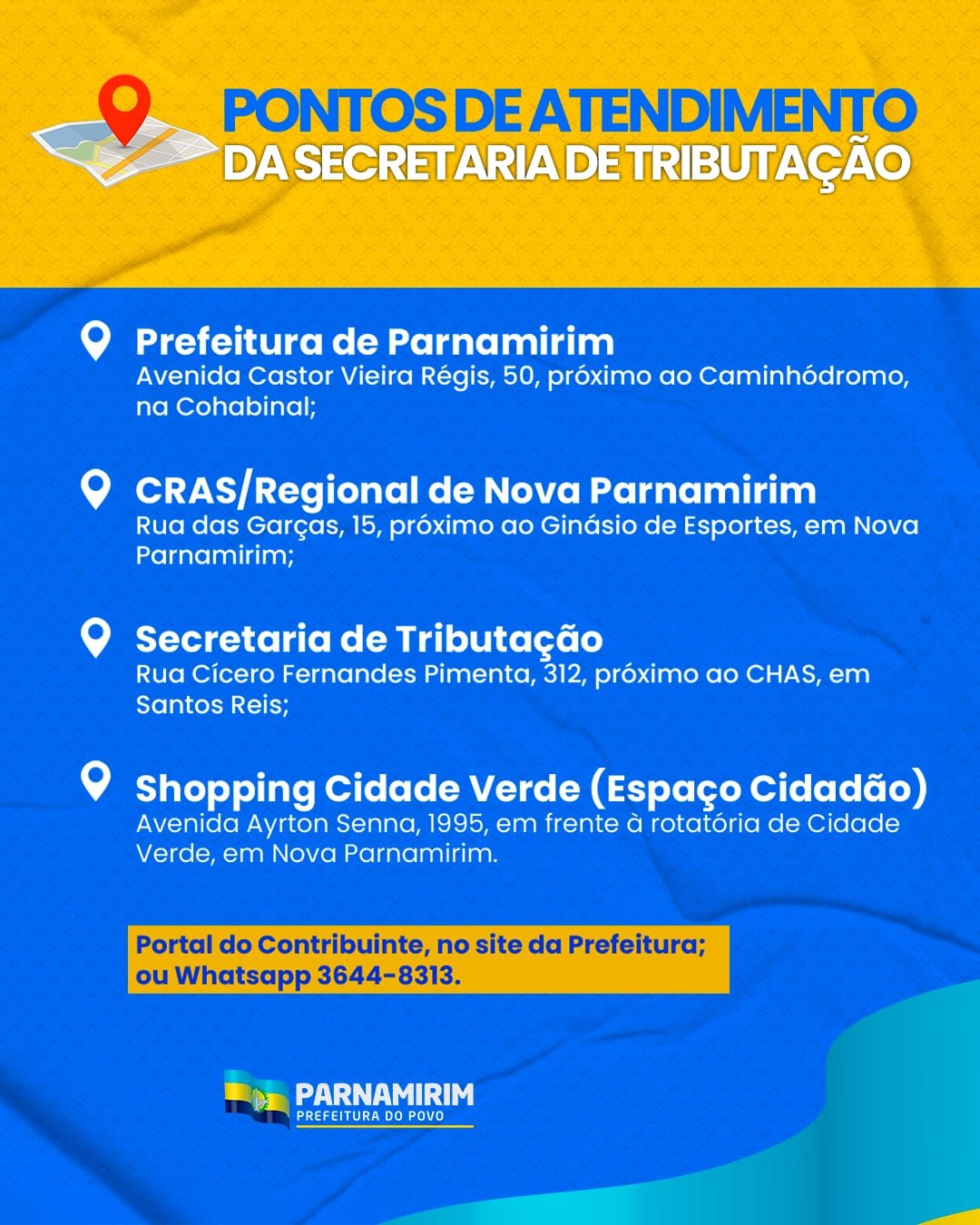 Com o fim do prazo do IPTU 2025 com desconto se aproximando, o município possibilita aos moradores de Nova Parnamirim uma nova opção de atendimento, além das já disponíveis. O tributo pode ser pago com 20% de desconto até esta sexta-feira, 14 de fevereiro. A Prefeitura de Parnamirim, por meio da Secretaria de Tributação, implantou um novo ponto de atendimento para regularização do IPTU. Os moradores de Nova Parnamirim ganharam mais uma opção de atendimento: o Espaço Cidadão, no Shopping Cidade Verde. O local vai funcionar de segunda a sexta-feira, das 8 às 14h, e vai possibilitar a retirada do boleto com desconto de 20% (até 14 de fevereiro) e a regularização de débitos em atraso com possibilidade de até 100% de redução nos juros e multas. A implantação do ponto foi possível graças à parceria do Shopping Cidade Verde, que cedeu o espaço sem custo para o município, com a Secretaria Municipal de Tributação, numa clara manifestação de confiança na gestão pública da cidade e de contribuição com o desenvolvimento e bem-estar da população parnamirinense. O cidadão atualmente conta com os seguintes pontos de atendimento: