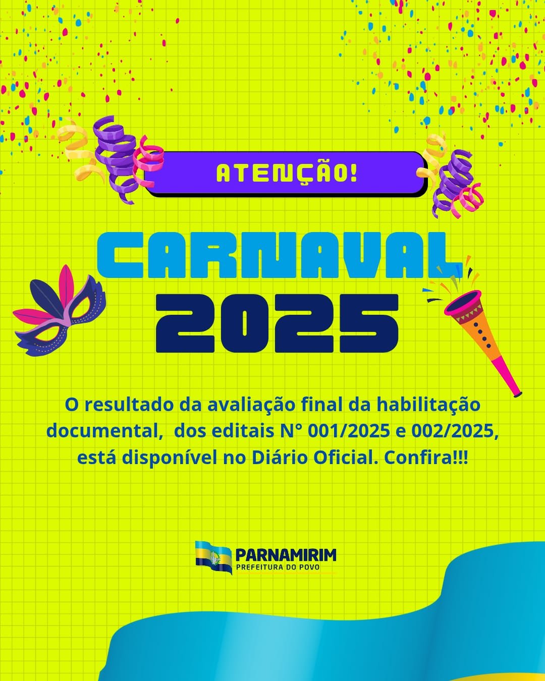 O objetivo é a concessão de apoio financeiro para bandas musicais, intérpretes e orquestras de frevo que vão compor a programação do Carnaval 2025. A Prefeitura de Parnamirim, por meio da Secretaria de Turismo e Desenvolvimento Econômico (Setude), divulgou o resultado final da habilitação documental de artistas, intérpretes, bandas, grupos musicais e orquestras de frevo aptos às próximas fases do processo seletivo. A Prefeitura orienta que os representantes leiam com atenção o edital e fiquem atentos às etapas subsequentes. A listagem completa está disponível no Diário Oficial do Município, edição deste sábado (8). Todos os detalhes podem ser consultados no Portal de Editais de Parnamirim.