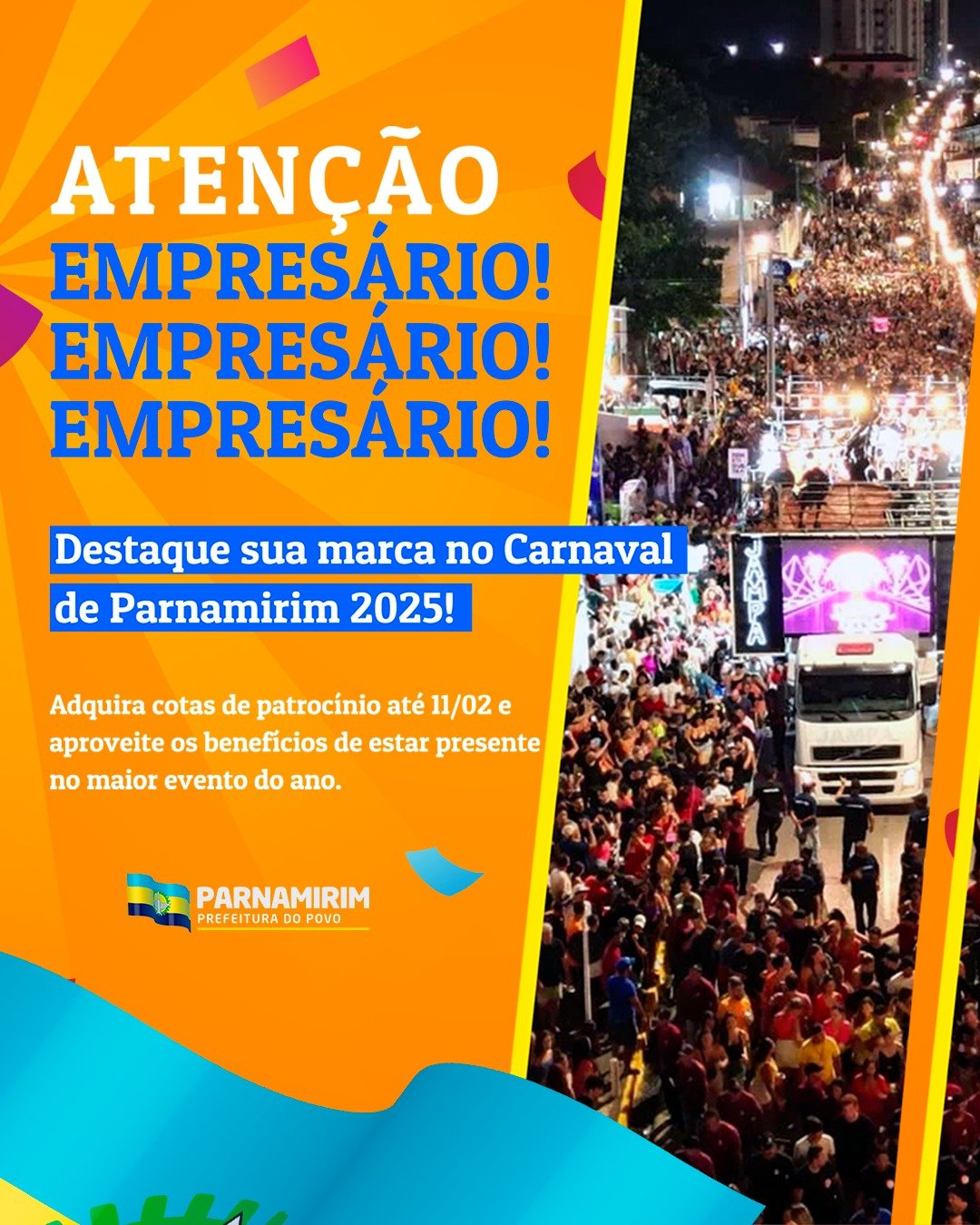 O objetivo é credenciar empresas privadas que terão o direito de veicular oficialmente suas marcas durante o evento em troca de uma contrapartida financeira que será destinada ao custeio do Carnaval de Parnamirim 2025. A Prefeitura de Parnamirim, por meio da Secretaria de Turismo e Desenvolvimento Econômico (Setude), lançou nesta semana o Edital de Chamamento Público voltado a empresas privadas interessadas em divulgar suas marcas como patrocinadoras do Carnaval 2025. Serão 12 cotas divididas em 3 categorias. Cada uma apresenta detalhes e particularidades sobre como se dará a divulgação das marcas, a saber: No total, os R$760.000,00 que o município espera arrecadar com os patrocínios serão integralmente utilizados no custeio do evento, que acontece de 21 de fevereiro a 5 de março de 2025. O Carnaval de Parnamirim é uma grande oportunidade de exposição para empresas que desejam veicular suas marcas em um evento que conta com a presença de foliões de todo o Brasil. De acordo com a Fecomércio RN, em 2024 mais de 80% dos empreendedores que trabalharam na festa avaliaram o impacto do evento de forma positiva em seus negócios, quando cerca de 400.000 pessoas movimentaram mais de R$118 milhões na cidade. Os interessados devem encaminhar as propostas até o dia 11 de fevereiro, das 8 às 12h, à sede da Setude. Cada proposta deve conter dois envelopes distintos devidamente lacrados, um contendo a proposição com definição da categoria pretendida e o outro, com os documentos de habilitação. A Secretaria de Turismo e Desenvolvimento Econômico (Setude) fica no Complexo da Prefeitura de Parnamirim, localizado na Avenida Castor Vieira Régis, Cohabinal. Dúvidas e esclarecimentos podem ser encaminhados ao Whatsapp da Setude, o (84) 97601-4216.