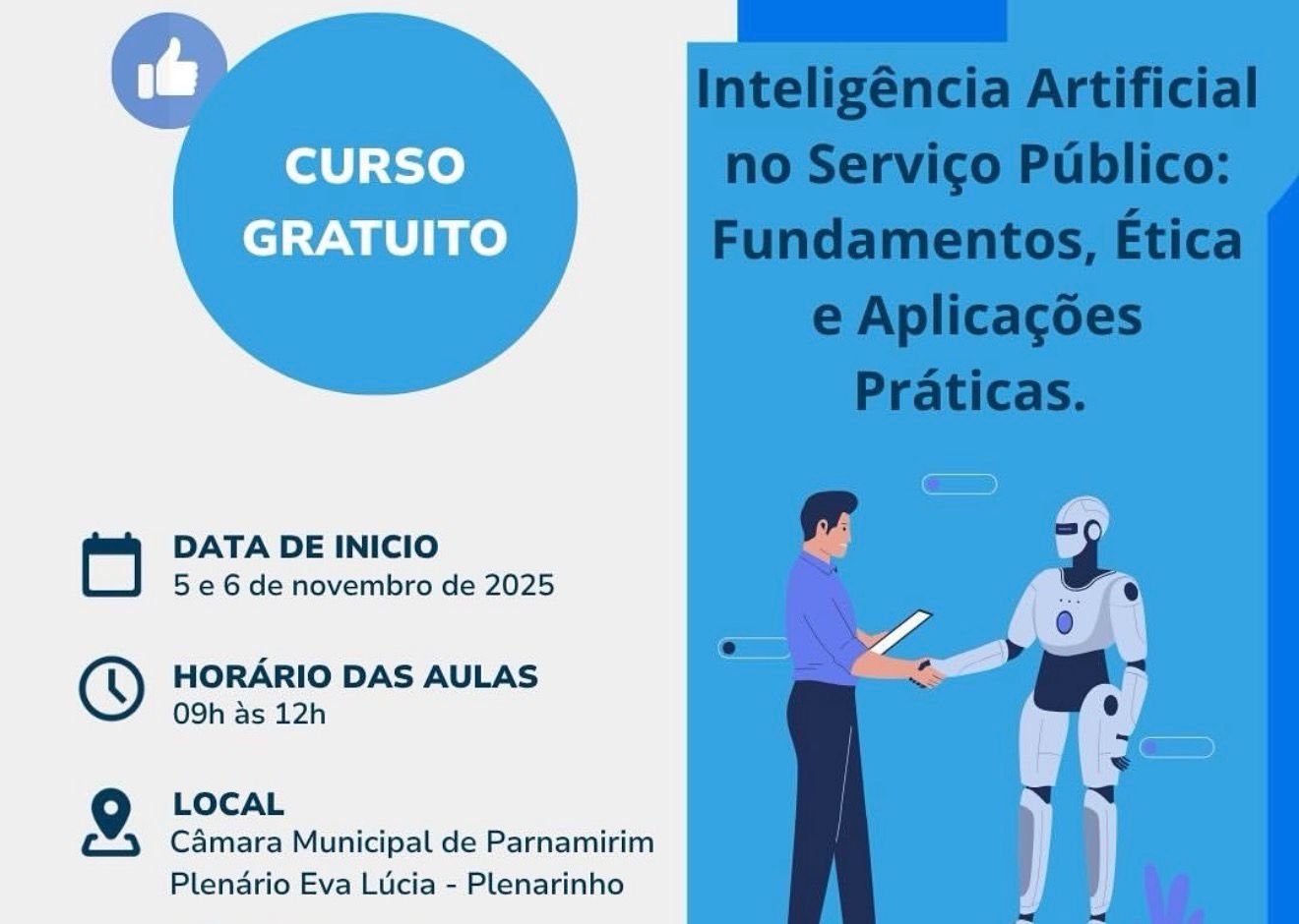 O uso da inteligência artificial (IA) na administração pública será tema de um curso promovido pela Escola do Legislativo Professora Eva Lúcia, nesta quarta e quinta-feira (5 e 6), às 9h, no Plenarinho da Câmara Municipal de Parnamirim. A capacitação vai abordar os fundamentos, a ética e as aplicações práticas da IA, com o objetivo de preparar os servidores públicos para os desafios da era tecnológica e para o uso consciente dessas ferramentas no cotidiano do trabalho. Ao todo, 35 pessoas se inscreveram para participar do curso, que foi organizado em resposta à crescente presença da tecnologia na gestão pública. Segundo a coordenadora da Escola do Legislativo, Josilane Marques, a iniciativa busca otimizar os serviços oferecidos à população parnamirinense e incentivar a inovação no serviço público. Durante as aulas, os participantes conhecerão ferramentas digitais voltadas à automação de tarefas, com foco no aumento da produtividade e na utilização responsável da inteligência artificial no ambiente de trabalho. CÂMARA MUNICIPAL DE PARNAMIRIM