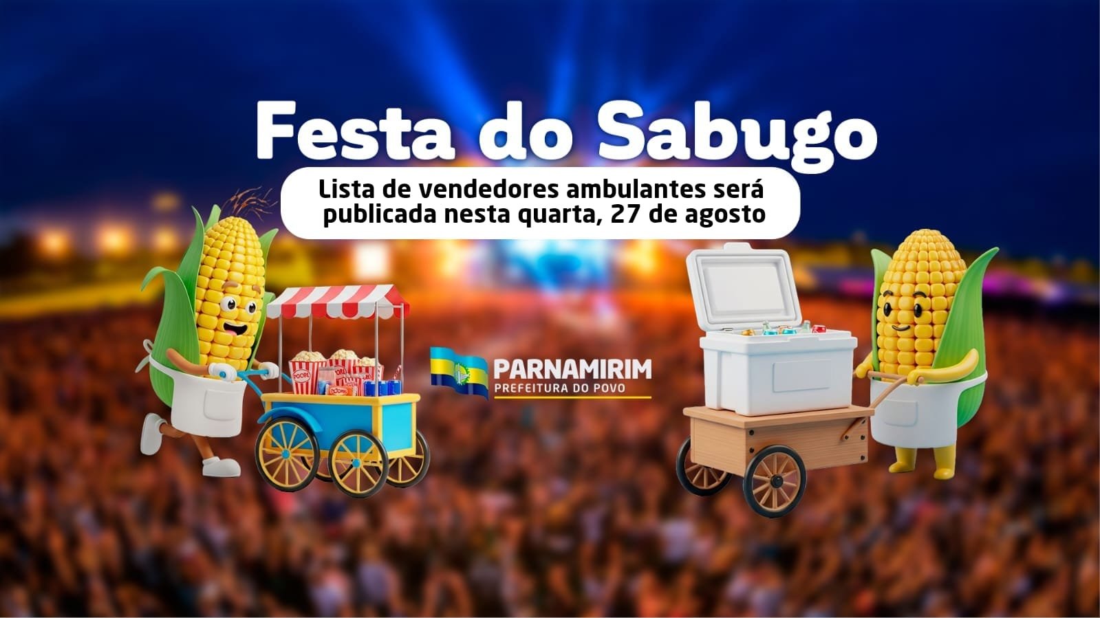 ORIENTAÇÕES AOS AMBULANTES O acesso ao evento para abastecimento será das 8h às 15h. A entrada fora desse horário está terminantemente proibida. Também não serão permitidas as seguintes condutas: Venda de bebidas em garrafas de vidro;Atuação de menores de idade ou de pessoas não credenciadas;Transferência de vagas a terceiros;Uso de fritadeiras e máquinas de chopp elétricas. SAIBA O QUE É PERMITIDO E QUAIS OS ITENS PROIBIDOS NA FESTA Por questões de segurança, não será permitida a entrada na Festa do Sabugo com os seguintes materiais: Armas;Objetos de vidro, como copos e garrafas, ou de metal;Objetos cortantes ou perfurantes;Capacetes;Materiais inflamáveis;Entorpecentes;Fogos de artifício;Sinalizadores ou similares;Mesas e cadeiras;Gelo com embalagem aberta. O objetivo é garantir uma noite de tranquilidade para quem vier ao local da festa. Quanto aos horários, na sexta-feira (29) e no sábado (30) a festa acontece até 3h (três horas da manhã). Já no domingo (31), os shows serão encerrados às 2h (duas horas da manhã) do dia seguinte. ESPAÇO PCD A Prefeitura vai disponibilizar um espaço voltado às pessoas com necessidades especiais. O objetivo será garantir acessibilidade, conforto e segurança para pessoas com deficiência e seus acompanhantes. O ambiente contará com infraestrutura adaptada, banheiros acessíveis, sinalização tátil/visual, equipe de apoio e localização estratégica para melhor visualização e participação no evento. Para ter acesso ao espaço, que vai comportar cerca de 300 pessoas, será necessário fazer uma inscrição no Portal de Editais da Prefeitura de Parnamirim (https://edital.setude.parnamirim.rn.gov.br/#/portal/inicio) e apresentar documento de identificação e laudo médico com CID ou carteira PCD no dia do evento. O prazo para se inscrever encerra nesta quarta-feira (27). PREFEITURA DE PARNAMIRIM