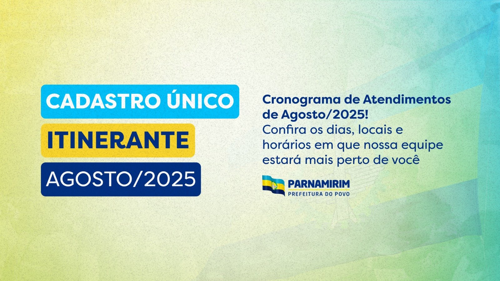 A Prefeitura de Parnamirim, através da Secretaria Municipal de Assistência Social (Semas), segue com o cronograma do Cadastro Único itinerante em todos os Centros de Referência da Assistência Social (CRAS) do município.A proposta do Cadastro Único itinerante é atender de forma mais ampliada e acessível a população parnamirinense de baixa renda, que deseja atualizar ou ser inserida na base de dados do Cadastro Único, uma vez que se faz necessário para ter acesso aos programas sociais do governo federal, como o Bolsa Família, Pé-de-Meia, Tarifa Social de Energia Elétrica, Auxílio Gás, Programa Minha Casa Minha Vida, entre outros.*Confira abaixo os dias, locais e horários:*Horário: *das 8h às 14h*01, 12 e 20/08 – CRAS Moita Verde;04, 13 e 21/08 – CRAS Monte Castelo;05,14 e 22/08 – CRAS Passagem de Areia;06, 15 e 25/08 – CRAS Vale do Sol;07, 18 e 26/08 – CRAS Parque Industrial;11, 19 e 27/08 – CRAS Nova Parnamirim.Os CRAS Bela Parnamirim, Litoral (Pium e Pirangi) e Liberdade já possuem cadastradores permanentes, garantindo que a população de abrangência desses CRAS seja atendida diariamente, conforme demanda. PREFEITURA DE PARNAMIRIM