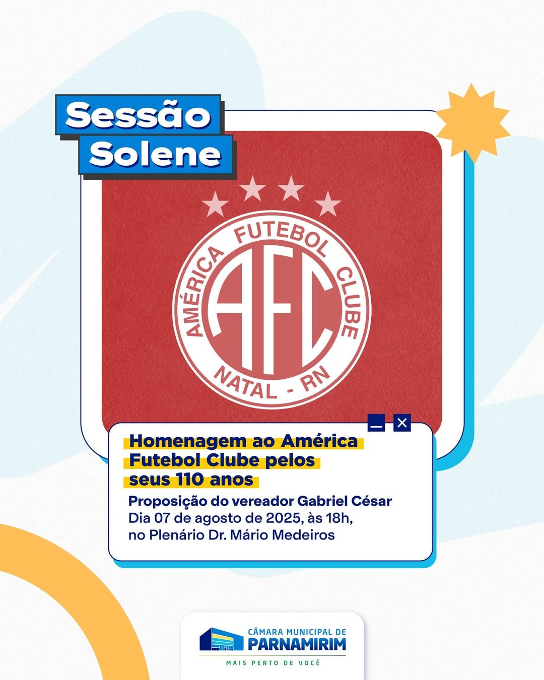 No ano em que o América Futebol Clube completa 110 anos, a Câmara de Parnamirim, por proposição do vereador Gabriel César, vai realizar uma sessão solene para homenagear o time potiguar. O evento ocorre no dia 07 de agosto, às 18h no plenário Dr. Mário Medeiros. Para a celebração, foram convidados a torcida e os atletas do América FC, o presidente do time, Hermano Moraes e o presidente da Sociedade Anônima de Futebol (SAF), Vitor Arteiro. A homenagem visa destacar o legado centenário do clube fundado em 1915, reconhecendo sua importância não apenas no cenário esportivo, mas também como um elemento cultural e social que une milhares de potiguares em torno da paixão rubra. A cerimônia será aberta ao público e a todos que desejam prestigiar essa justa homenagem ao clube que faz vibrar o coração rubro dos norte-rio-grandenses. SERVIÇOO QUÊ: Sessão solene em homenagem ao América Futebol ClubeQUANDO: Quinta-feira, 7 de agosto às 18hONDE: Plenário Dr. Mário Medeiros, na Câmara Municipal de Parnamirim CÂMARA MUNICIPAL DE PARNAMIRIM