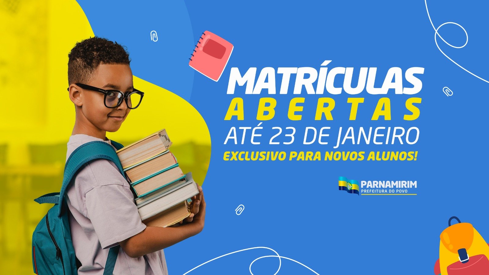 A Prefeitura de Parnamirim, por meio da Secretaria Municipal de Educação (SME), segue com o período de matrículas para novos alunos da rede municipal de ensino referente ao ano letivo de 2026. O prazo para inscrição vai até o dia 23 de janeiro. Neste ano, estão sendo ofertadas cerca de 3 mil novas vagas, com o objetivo de garantir o direito à educação e contribuir para um futuro com mais oportunidades para crianças e jovens do município. As vagas são destinadas a estudantes que desejam ingressar na Educação Infantil e no Ensino Fundamental da rede municipal. Conforme determina a legislação, haverá prioridade para irmãos matriculados na mesma unidade escolar. Também permanecem abertas as vagas destinadas a alunos com Necessidades Educacionais Específicas (NEE). A solicitação de matrícula deve ser realizada de forma online, por meio do site https://parnamirim-rn.portalsigeduc.com.br/app/public/home.jsf . Após a confirmação da vaga, os pais ou responsáveis deverão comparecer à unidade escolar escolhida com toda a documentação exigida. Entre os documentos necessários estão: cópia da certidão de nascimento do aluno, documentação escolar (quando houver), cópia do cartão de vacinação, comprovante de residência, fotos recentes e, no caso de estudantes com deficiência, laudo médico que comprove a condição. As famílias que encontrarem dificuldades para acessar o portal de matrículas online podem procurar a unidade escolar mais próxima de sua residência ou o Setor de Inspeção Escolar da SME, onde receberão orientação e apoio para a realização da solicitação. PREFEITURA DE PARNAMIRIM