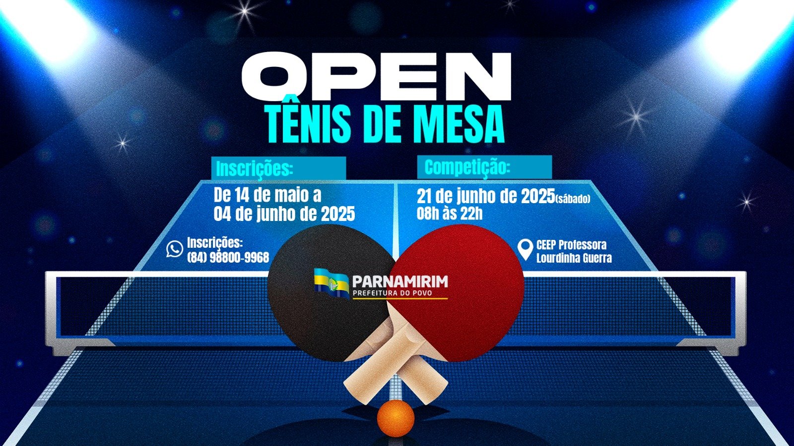 Excelente novidade para os amantes do esporte de Parnamirim, em especial para os mesatenistas. A Prefeitura, por meio da Secretaria de Esporte e Lazer (SEL), está com as inscrições abertas para o 1º Open de Tênis de Mesa nas categorias masculina e feminina (idade livre). A competição será realizada no dia 21 de junho (sábado), a partir das 8h, no Centro Estadual de Educação Profissional (CEEP) Professora Lourdinha Guerra, que fica em Nova Parnamirim. As inscrições já estão abertas e podem ser feitas gratuitamente pelo whatsapp (84) 98800-9968. O prazo para se inscrever vai até o dia 04/06. A Prefeitura vai premiar os melhores atletas com troféus e medalhas. PREFEITURA DE PARNAMIRIM