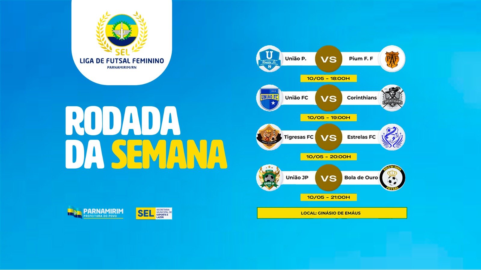 Mais um final de semana esportivo em Emaús, Parnamirim. O Ginásio do bairro recebe neste sábado (10), a partir das 18h, mais uma rodada da Liga Municipal de Futsal Feminino. Quatro partidas vão animar a noite dos moradores da localidade que já estão convidados a acompanhar a disputa. O acesso à praça esportiva, como sempre, será gratuito. Confira os confrontos: 18h – União P. x Pium F. F 19h – União FC x Corinthians 20h – Tigresas FC x Estrelas FC 21h – União JP x Bola de Ouro A Liga Municipal de Futsal Feminina é realizada pela Prefeitura de Parnamirim, por meio da Secretaria de Esporte e Lazer. PREFEITURA DE PARNAMIRIM