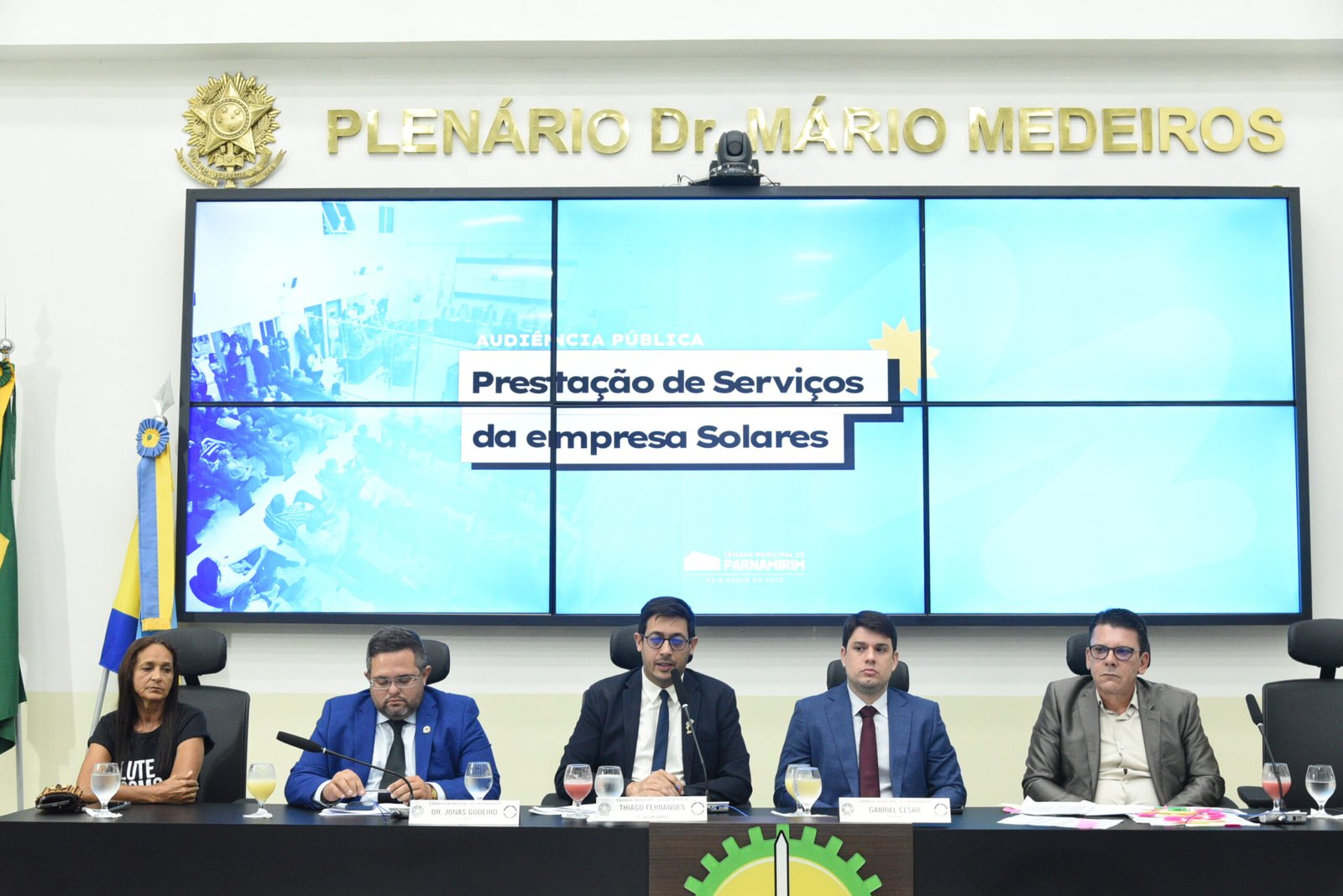 Buscando debater, junto à comunidade local, a prestação de serviços terceirizados pela empresa Solares ao município de Parnamirim, foi realizada uma Audiência Pública no Plenário Dr. Mário Medeiros, na última terça-feira (6). Proposta pelos vereadores Thiago Fernandes, Jonas Godeiro e Gabriel César, a audiência reuniu representantes da sociedade e do poder público. A população, entidades representativas e servidores municipais participaram do diálogo sobre as condições de trabalho, remuneração, direitos trabalhistas e obrigações contratuais relacionadas aos funcionários vinculados à Solares. “Vamos ouvir, dialogar e, juntos, apresentar uma solução e uma proposta para que a gestão resolva a situação”, declarou o vereador Jonas Godeiro ao abrir os pronunciamentos. Durante a audiência, o diretor da Solares, Caio Honorário, apresentou documentos que evidenciam os prejuízos financeiros enfrentados pela empresa e solicitou que fossem assegurados o respeito e a justiça aos trabalhadores. Em seguida, Ana Lúcia, representante dos funcionários da Solares, destacou o descaso vivenciado pela categoria. “Nós estamos aqui para servir à população de Parnamirim”, afirmou. Composição do dispositivo de honra Além dos três vereadores proponentes da audiência pública, compuseram a mesa o diretor da Construtora Solares, Caio Honório, e a representante dos demais funcionários da empresa Ana Lúcia Alves da Silva. O vereador Thiago Fernandes, que presidiu a audiência, destacou a ausência de um representante do Poder Executivo. CÂMARA MUNICIPAL DE PARNAMIRIM