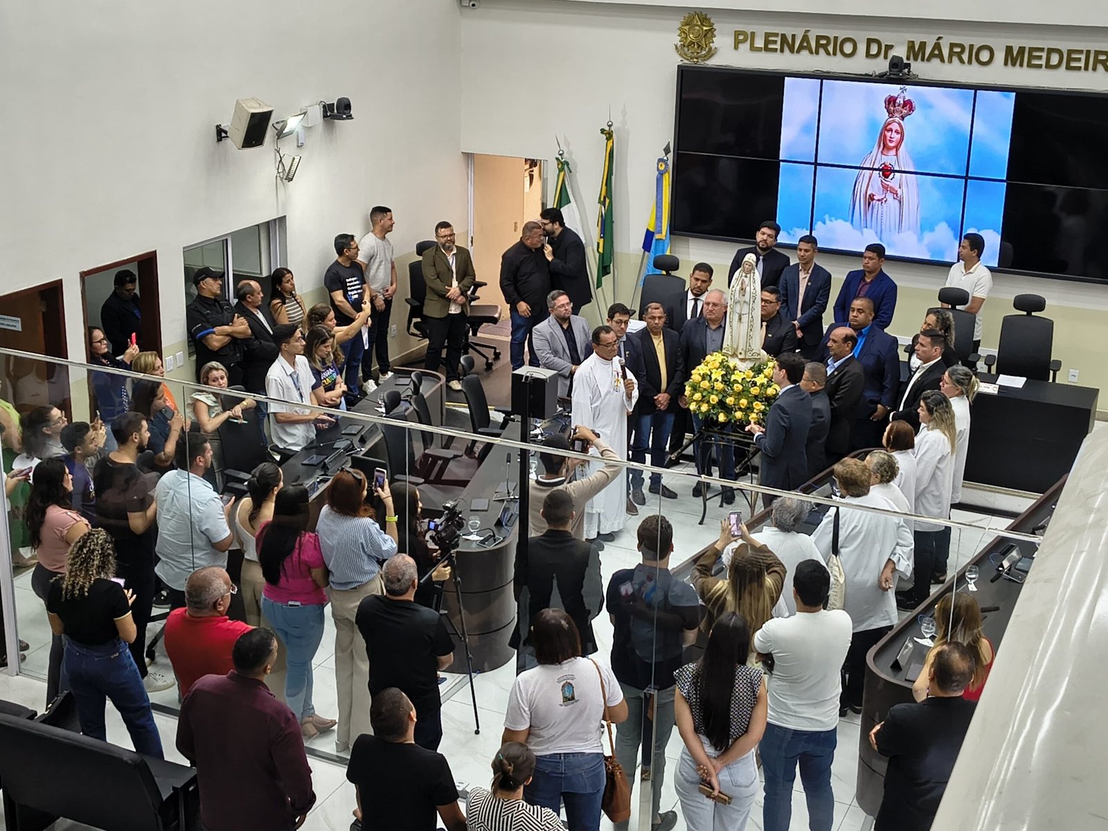 Nesta quarta-feira (07), a Câmara Municipal de Parnamirim recebeu a imagem de Nossa Senhora de Fátima, como parte da celebração da Festa da Padroeira. Com a chegada da santa ao Plenário Dr. Mário Medeiros, foi realizado um momento de fé e devoção entre os vereadores e o público presente. O diácono Lenildo (Passarinho) conduziu o momento e fez uma breve fala sobre unidade e atenção aos mais necessitados. O presidente da Casa, vereador Dr. César Maia, também discursou: “É motivo de muita felicidade estar recebendo hoje a imagem de Nossa Senhora de Fátima, nós que somos uma Casa democrática, buscamos todos os dias fazer o melhor pelo próximo e queremos deixar um legado de empatia”. A imagem de Nossa Senhora de Fátima ficará exposta no plenário até o final da tarde, quando sairá em carreata até a Igreja Matriz. Na ocasião, será celebrada uma missa, às 19h, na qual a Câmara de Parnamirim será “Noiteira”. CÂMARA MUNICIPAL DE PARNAMIRIM