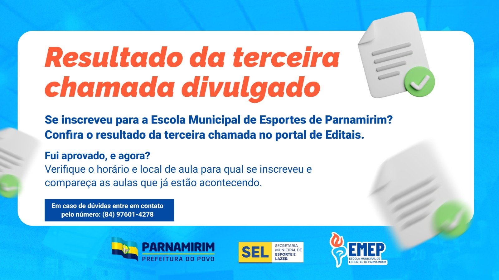 A Prefeitura de Parnamirim, por meio da Secretaria de Esporte e Lazer (SEL), publicou o resultado da terceira chamada para a Escola Municipal de Esportes de Parnamirim (Emep). A lista dos contemplados está disponível no Portal de Editais do site da Prefeitura de Parnamirim (https://editais.parnamirim.rn.gov.br/sel/#/portal/inicio). A Emep oferece vagas a estudantes de 7 a 17 anos em 6 polos distribuídos pela cidade nas modalidades de futsal, futebol, vôlei, basquete, taekwondo e handebol. Os aprovados devem comparecer ao polo correspondente no horário da aula a partir desta quarta-feira (7). Informações – (84) 97601-4278. PREFEITURA DE PARNAMIRIM
