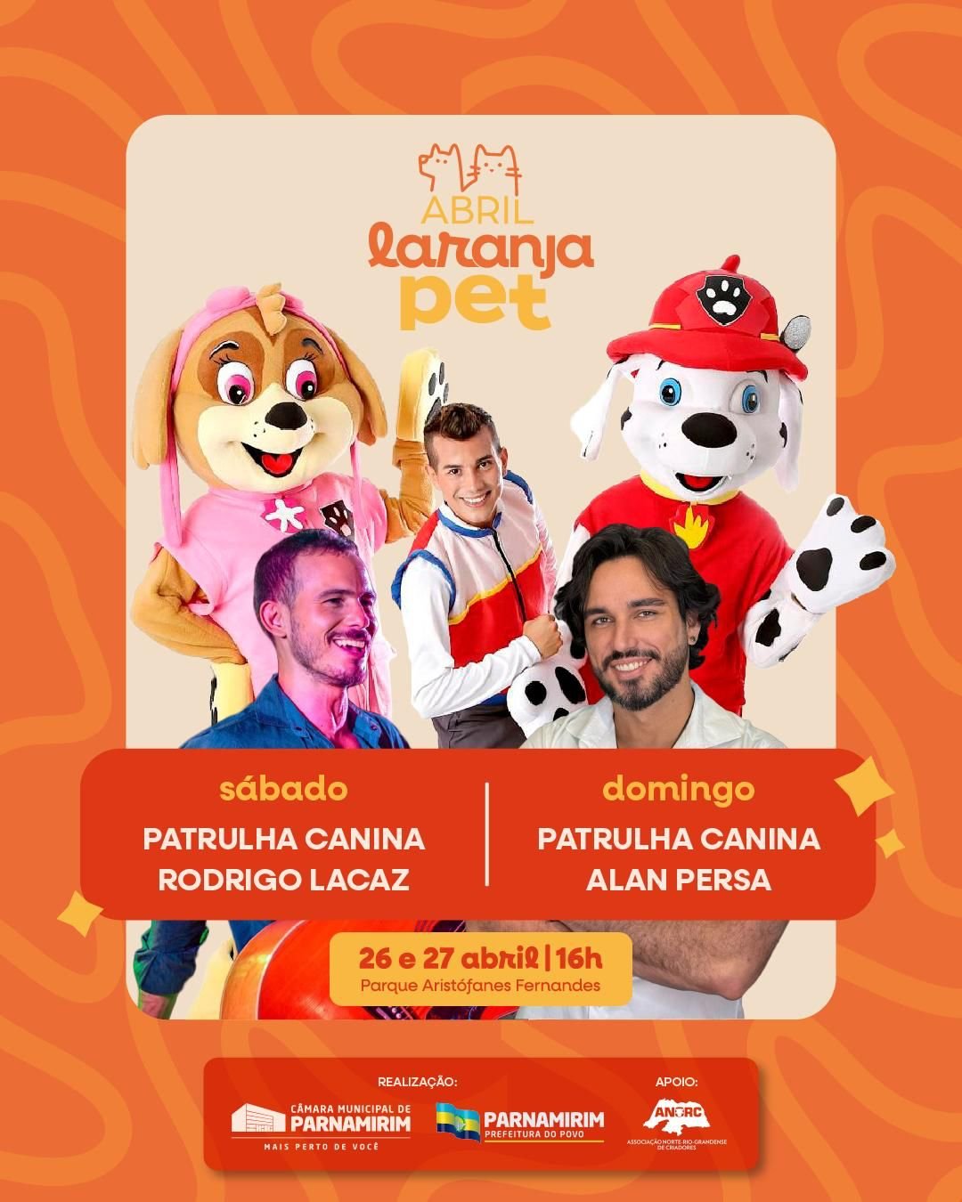 A Câmara Municipal de Parnamirim está promovendo o Abril Laranja Pet, neste final de semana, nos dias 26 e 27 de abril, a partir das 16h, no Parque Aristófanes Fernandes. O evento ocorre em alusão à campanha nacional de conscientização e combate aos maus-tratos contra os animais e é uma iniciativa da recém-criada Frente Parlamentar em Defesa dos Animais. No local, haverá uma ampla estrutura para receber a população. A programação inclui feira de adoção, vacinação, maratona pet e exposições. Além disso, o evento conta com apresentações culturais, espaço kids, área gastronômica, entrega de brindes e muito mais. Também haverá orientações para a emissão da carteira de identidade pet. No sábado, entre os destaques estão o Câmara Cultural Pet e, entre as atrações confirmadas, estão os shows de Rodrigo Lacaz e Patrulha Canina. No domingo, a programação inclui o projeto Domingo no Parque, uma iniciativa em parceria com a Prefeitura de Parnamirim, que oferece momentos de lazer e entretenimento para os tutores presentes. Na ocasião, haverá shows de Alan Persa e Patrulha Canina para a criançada. Além disso, haverá a aguardada Maratona Pet, com premiação para os três melhores colocados e também um prêmio de incentivo para o último a chegar. As inscrições para a participação estão abertas e podem ser realizadas no site da Casa Legislativa (www.camaraparnamirim.rn.gov.br). Com essa iniciativa, a Câmara Municipal de Parnamirim reafirma seu compromisso com a causa animal e convida toda a comunidade a engajar na luta contra os maus-tratos. ServiçoO quê: Dia D Abril Laranja PetQuando: 26 e 27 de abril, a partir das 16hProposição: Frente Parlamentar em Defesa dos AnimaisOnde: Parque Aristófanes Fernandes CÂMARA MUNICIPAL DE PARNAMIRIM