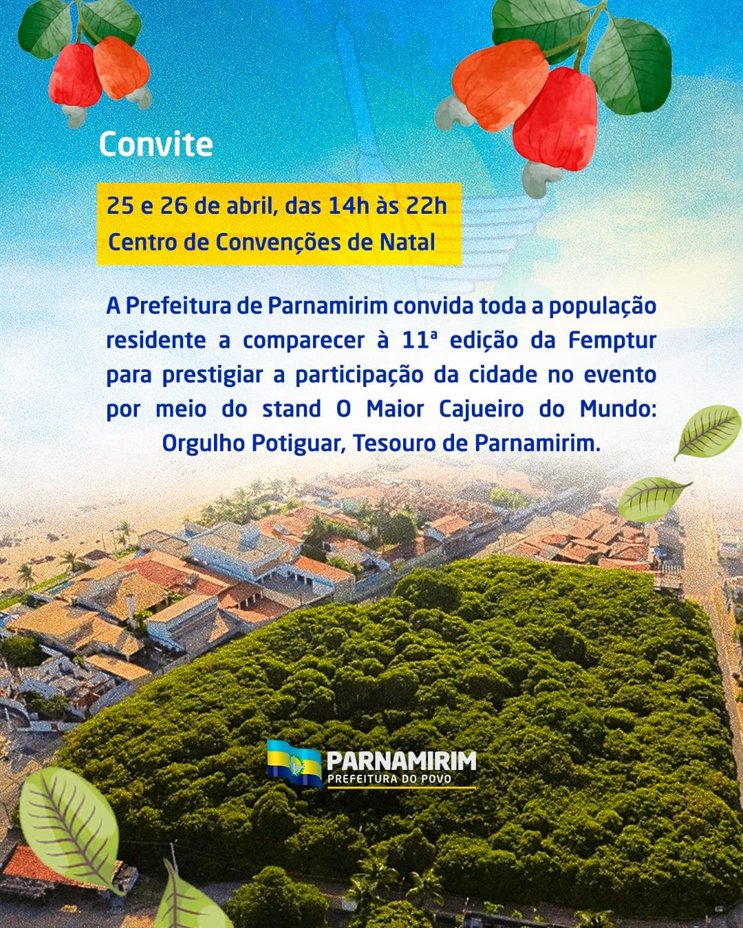 CONVITE 11ª EDIÇÃO DA FEMPTUR, A Prefeitura de Parnamirim estara presente com Stand “O Maior Cajueiro do Mundo: Orgulho Potiguar, Tesouro de Parnamirim.”