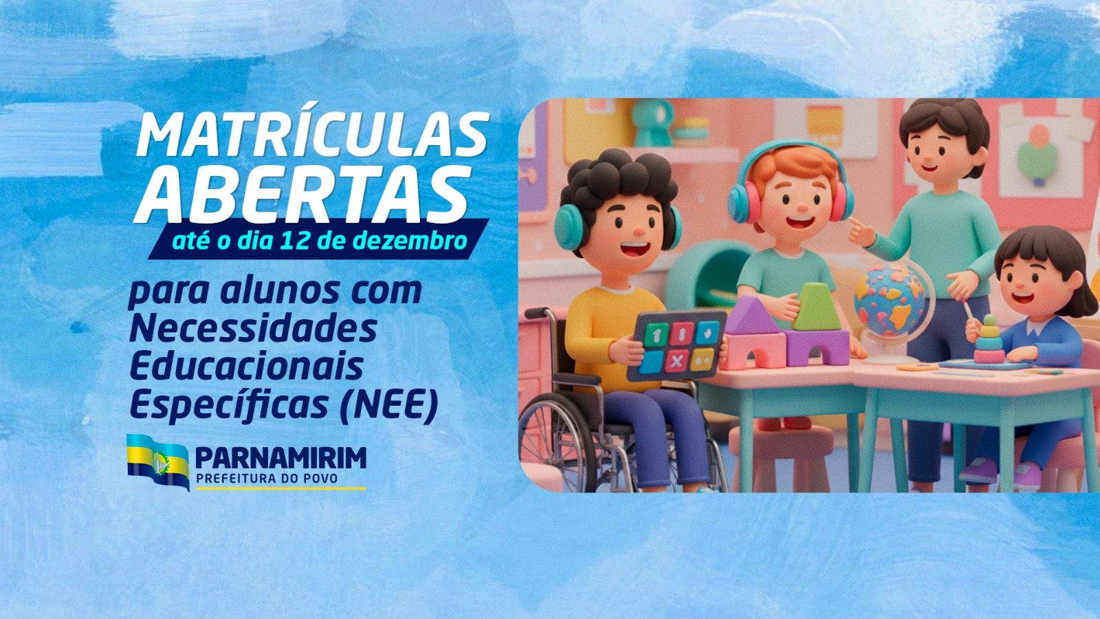 A Prefeitura de Parnamirim, por meio da Secretaria Municipal de Educação (SME), iniciou o período de matrículas para o ano letivo de 2026 destinado aos alunos com Necessidades Educacionais Específicas (NEE). Os pais ou responsáveis devem realizar a solicitação até o dia 12 de dezembro pelo site www.parnamirim-rn.portalsigeduc.com.br . Após a confirmação da vaga, é necessário comparecer à unidade escolar escolhida, nos dias 15 e 16 de dezembro, com toda a documentação exigida. A documentação necessária inclui: cópia da certidão de nascimento; documentação escolar; cópia do cartão de vacina; cópia do comprovante de residência; fotos recentes; e laudo médico que ateste a deficiência do aluno. As pessoas que tiverem dificuldade de acessar o portal de matrículas online podem procurar a unidade escolar mais próxima de sua residência ou o Setor de Inspeção Escolar da SME, onde receberão atendimento e terão a solicitação realizada. Confira o cronograma geral de matrículas para 2026 na rede municipal: Durante o período de matrículas, terão prioridade os estudantes que possuem irmãos já matriculados na escola desejada, conforme estabelece a Lei Ordinária nº 2.485, de 23 de fevereiro de 2024. PREFEITURA DE PARNAMIRIM