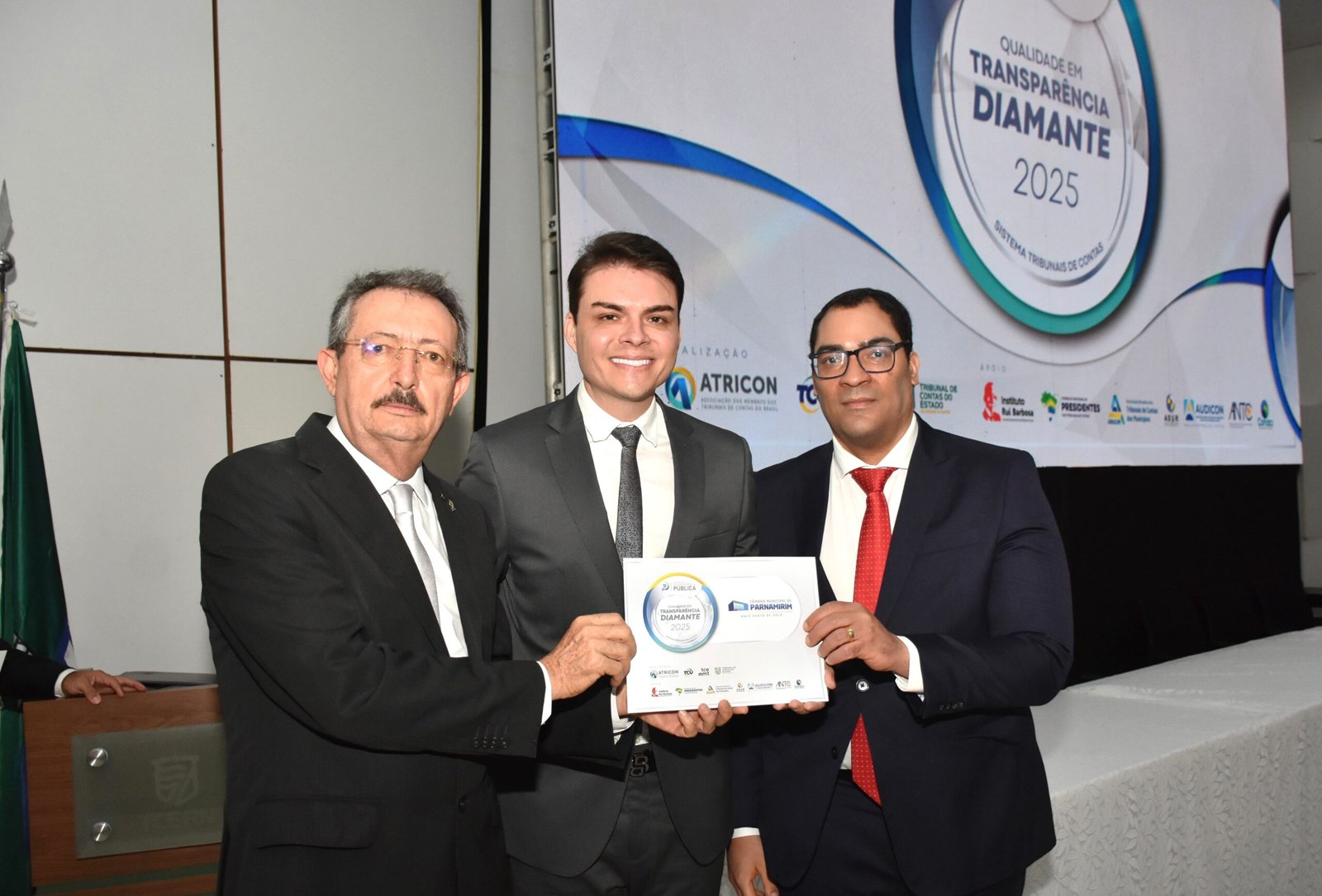 Em uma solenidade ocorrida, nesta sexta-feira (12), o presidente da Câmara de Parnamirim, vereador Dr. César Maia, recebeu a certificação do Selo Diamante de Transparência 2025 diretamente das mãos de representantes do Tribunal de Contas do Estado do Rio Grande do Norte (TCE-RN), conselheiro Carlos Thompson, em um evento com mais de 600 participantes. No momento, também estiveram presentes parlamentares e servidores da Câmara de Parnamirim. A Casa Legislativa alcançou 95,17% no nível de transparência e a conquista confirma o avanço e consistência da instituição na agenda de transparência e acesso à informação. Avanço na transparência pública Segundo o TCE-RN, o Rio Grande do Norte registrou um avanço inédito nos níveis de transparência pública em 2025. Durante a 24ª edição da Sexta de Contas, foram entregues 141 Selos de Qualidade em Transparência Pública a entes potiguares que alcançaram os níveis Diamante, Ouro e Prata no ciclo 2025 do Programa Nacional de Transparência Pública. O crescimento foi expressivo em relação ao ciclo anterior, quando apenas 45 entes do RN haviam sido certificados, sendo 11 com selo Diamante, 15 com Ouro e 19 com Prata. Com o volume quase triplicado, o estado indica uma mudança estrutural na forma como prefeituras, câmaras e órgãos estaduais organizam, atualizam e disponibilizam informações públicas. Mais informações no site do TCE/RN: https://www.tce.rn.gov.br/Noticias/NoticiaDetalhada/7787#gsc.tab=0 CÂMARA MUNICIPAL DE PARNAMIRIM