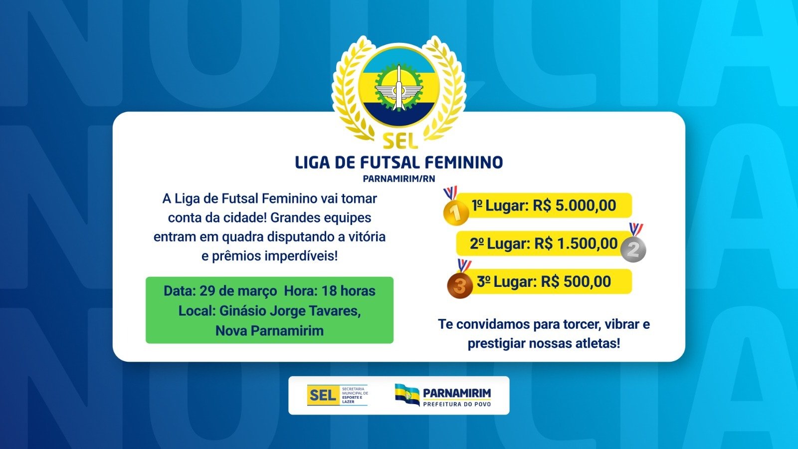 A competição, que será realizada pela Prefeitura de Parnamirim, vai reunir equipes da cidade na disputa que tem início neste fim de semana. A equipe campeã vai receber R$5 mil de premiação, troféu e medalhas. A Prefeitura de Parnamirim, por meio da Secretaria de Esporte e Lazer (SEL), dará o pontapé inicial em mais uma competição municipal, a Liga de Futsal Feminino. O evento de abertura acontece neste sábado (29), a partir das 18h, no Ginásio Jorge Tavares de Morais, em Nova Parnamirim, com entrada gratuita. A abertura do torneio vai contar com a animação do quinteto de músicos da Secretaria Municipal de Cultura. A disputa acontece com até 12 equipes de diversos bairros da cidade em dois grupos. As duas melhores equipes de cada grupo fazem as semifinais e os vencedores disputam a grande final. O torneio deve movimentar a comunidade esportiva, famílias, que sempre se fazem presentes nesse tipo de evento, e os amantes do futsal. As rodadas serão realizadas sempre nos finais de semana, com jogos no sábado e domingo, nos ginásios de Nova Parnamirim e Emaús. A grande final está prevista para acontecer no dia 10 de maio, no Ginásio de Nova Parnamirim. As melhores equipes receberão da Prefeitura de Parnamirim a seguinte premiação: Campeão: R$5.000,00, troféu e medalhas;Vice-campeão: R$1.500,00, troféu e medalhas;Terceiro lugar: R$500,00 e medalhas. A Secretaria de Esporte e Lazer também vai conceder premiações individuais para a artilheira, melhor goleira e melhor jogadora da competição. PREFEITURA DE PARNAMIRIM