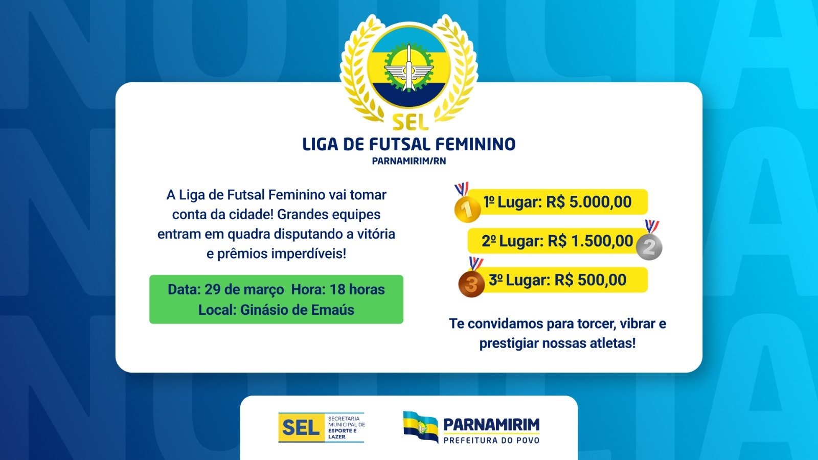 A competição, que será realizada pela Prefeitura de Parnamirim, vai reunir equipes da cidade na disputa que tem início neste fim de semana. A equipe campeã vai receber R$5 mil de premiação, troféu e medalhas, mas atenção! As inscrições podem ser feitas até esta terça-feira (25). A Prefeitura de Parnamirim, por meio da Secretaria de Esporte e Lazer (SEL), dará o pontapé inicial em mais uma competição municipal, a Liga de Futsal Feminino. O evento de abertura acontece neste sábado (29), a partir das 18h, no Ginásio de Emaús, com entrada gratuita. INSCRIÇÕES: Para participar da competição, as equipes devem preencher o formulário disponível no link https://docs.google.com/forms/d/e/1FAIpQLSe81KSatsDgablSvwhbOYciEMwHHswKjBKeRUpn9gyn0E-OuQ/viewform?fbzx=5812751788121888188. O prazo para inscrição encerra nesta terça-feira (25). Em caso de dúvidas, os interessados podem entrar em contato pelo Whatsapp (84) 99601-4209 ou pelo Instagram @selparnamirim. O torneio vai contar com até 12 equipes de diversos bairros da cidade e será disputado em dois grupos. As duas melhores equipes de cada grupo fazem as semifinais e os vencedores disputam a grande final. O torneio deve movimentar a comunidade esportiva, famílias, que sempre se fazem presentes nesse tipo de evento, e os amantes do futsal. As rodadas serão realizadas sempre nos finais de semana, com jogos no sábado e domingo, nos ginásios de Nova Parnamirim e Emaús. A grande final está prevista para acontecer no dia 10 de maio, no Ginásio de Nova Parnamirim. As melhores equipes receberão da Prefeitura de Parnamirim a seguinte premiação: Campeão: R$5.000,00, troféu e medalhas;Vice-campeão: R$1.500,00, troféu e medalhas;Terceiro lugar: R$500,00 e medalhas. A Secretaria de Esporte e Lazer também vai conceder premiações individuais para a artilheira, melhor goleira e melhor jogadora da competição. PREFEITURA DE PARNAMIRIM