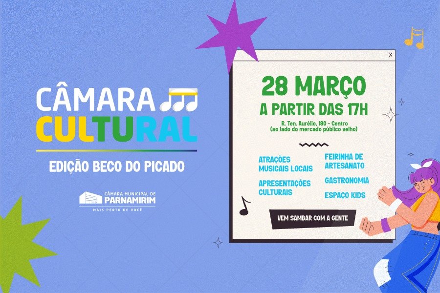 Pagode do Coxa, Marília Rosas e Jane Cortez são as atrações da primeira edição do projeto Câmara Cultural deste ano, promovido pela Câmara Municipal de Parnamirim. O evento dá início ao retorno das atividades realizadas nos diversos bairros da cidade e ocorre na próxima sexta-feira (28), a partir das 17h, no Centro. Essa edição tem um objetivo especial que é promover a revitalização e o resgate histórico do Beco do Picado, que já foi polo cultural e tradicional ponto boêmio da cidade. A ideia é que o espaço volte a sediar eventos culturais ao longo do ano, fortalecendo a identidade e a memória da cidade, transformando-o novamente em um ponto de cultura e lazer para os parnamirinenses. As apresentações musicais começam a partir das 17h, na estrutura de palco que será montada na R. Ten. Aurélio, 180, ao lado do mercado público velho. O evento vai reunir artistas, artesãos e comerciantes locais, visando valorizar a cultura da cidade e proporcionar acesso ao entretenimento e lazer. O projeto “Câmara Cultural” é de autoria da Mesa Diretora da Casa e foi aprovado, à unanimidade, através da Resolução n⁰ 09/2015. O objetivo principal é estimular e movimentar o cenário cultural no município de Parnamirim. ServiçoEvento: 1ª edição do Câmara Cultural 2025Data: 28 de março (sexta-feira);Horário: a partir das 17hLocalização: Beco do Picado, R. Ten. Aurélio, 180-226 – Centro, Parnamirim (ao lado do antigo Mercado Público);Realização: Câmara Municipal de Parnamirim. CÂMARA MUNICIPAL DE PARNAMIRIM