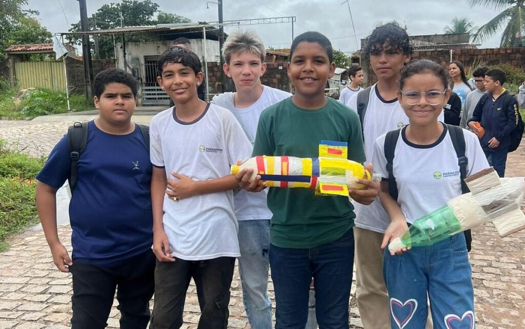 Os alunos da Escola Municipal de Tempo Integral Joana Alves de Lima, em Cajupiranga, vivenciaram uma experiência diferenciada nesta quinta-feira (15). A unidade de ensino se transformou em uma verdadeira plataforma de lançamento de foguetes. Isso mesmo. O local foi palco de uma ação relativa a Olimpíada Brasileira de Astronomia, iniciativa promovida pelo Ministério da Educação (MEC). Na oportunidade, os estudantes das turmas do 6º ao 9º ano fizeram o lançamento de foguetes fabricados por eles, aliando conhecimento e diversão. Cerca de 20 foguetes foram lançados.