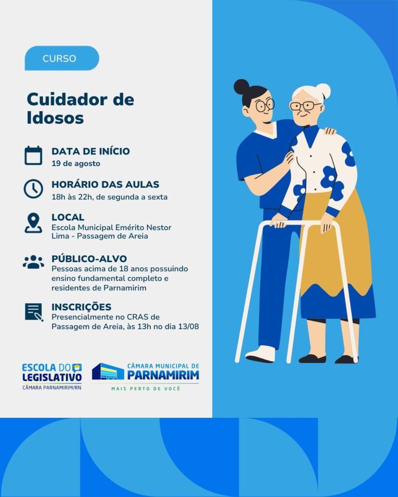 A Escola do Legislativo de Parnamirim, por meio do Projeto Novos Horizontes, anuncia a abertura de vagas para o Curso gratuito de Cuidador de Idosos. O objetivo é oferecer qualificação profissional e oportunidades de geração de renda para a população, especialmente para aqueles em situação de vulnerabilidade.