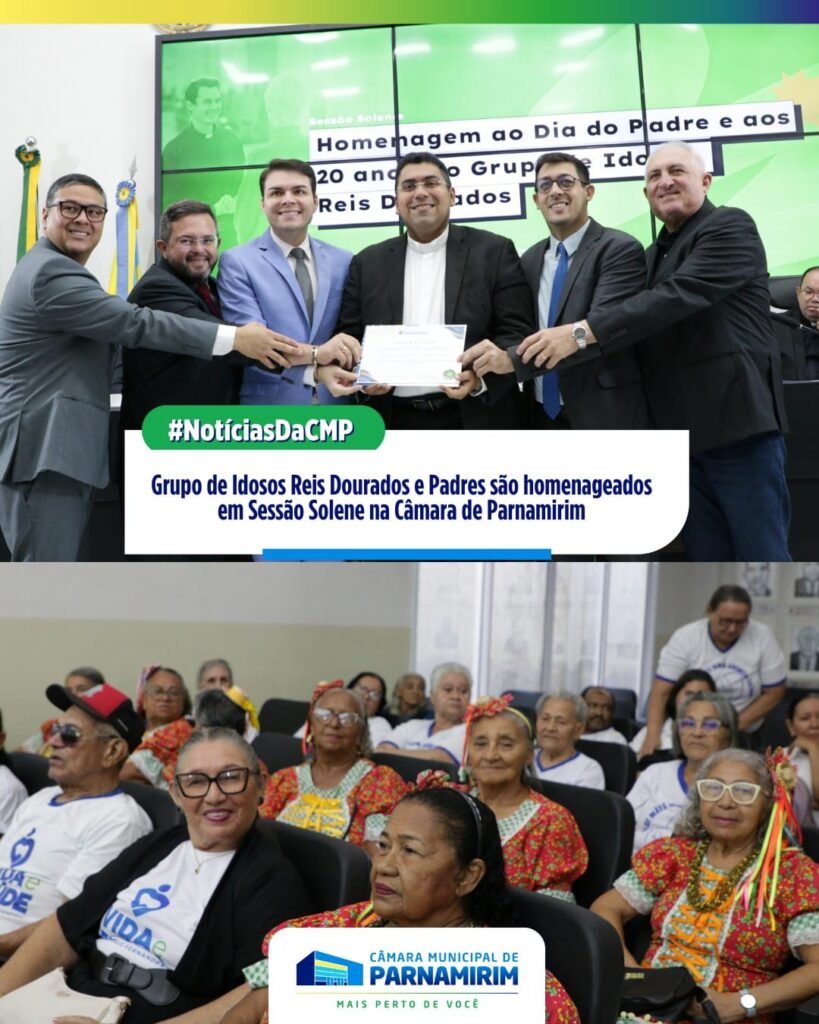👥Na ocasião, receberam a homenagem os idosos do grupo Reis Dourados, entidade responsável por promover atividades de lazer e cultura e qualidade de vida para o público, e cerca de 7 padres de diferentes paróquias do município. A homenagem aos párocos se dá em razão da comemoração ao Dia do Padre, celebrado todo dia 04 de agosto.