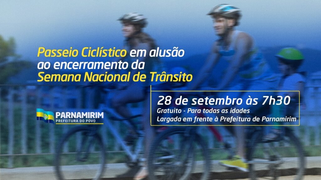 A Prefeitura de Parnamirim, por meio da Secretaria Municipal de de Segurança, Defesa Social e Mobilidade Urbana (Sesdem), estará realizando neste domingo, 28, o Passeio Ciclístico em alusão a Semana Nacional de Trânsito, com concentração em frente à Prefeitura a partir das 7h30, é uma ação gratuita e marca o encerramento da campanha que teve início no dia 18.